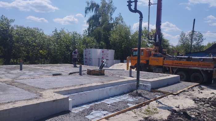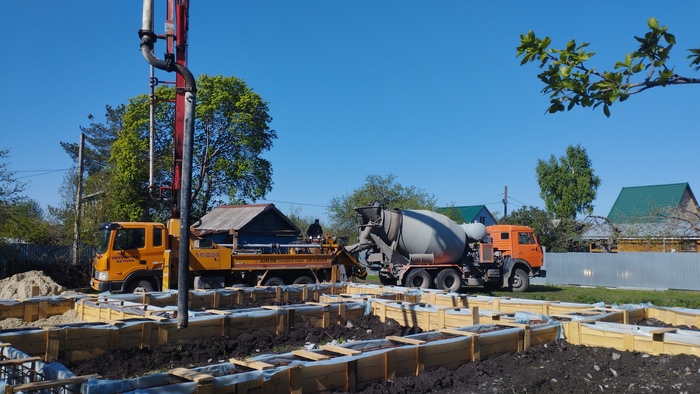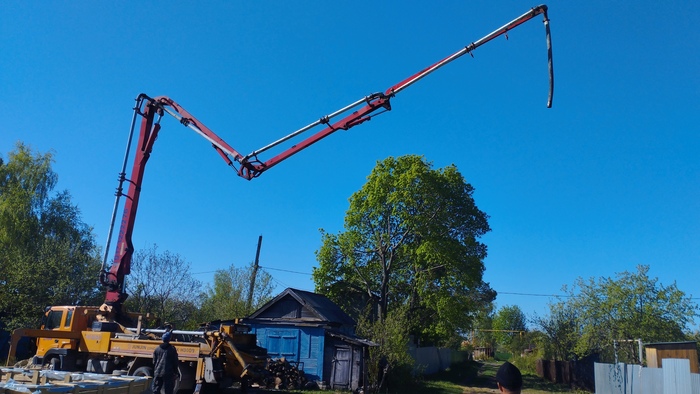 Поскольку участок 6 соток, особо не развернешься, подьезд только с одной стороны, заливать пришлось с помощью бетононасоса. Лили марку В250, всего ушло 24 м3