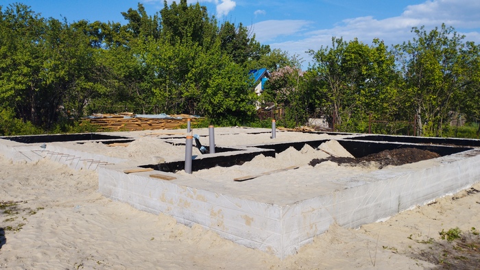 По состоянию на данный момент : опалубки сняли, внутреннюю сторону обработали битумом, развели канализацию и бросили закладные под воду и электричество. Засыпаем песком, ещё не трамбовали.