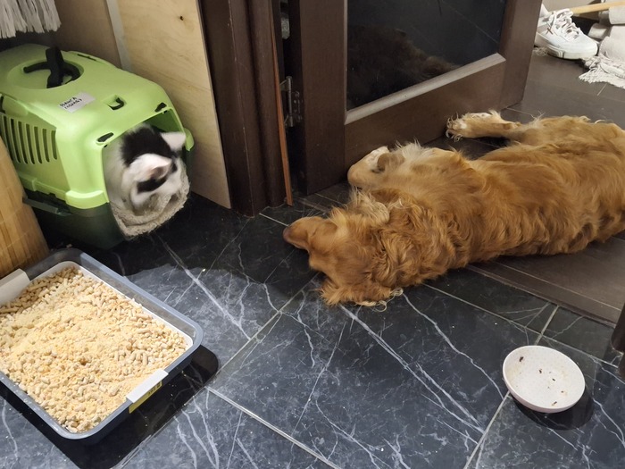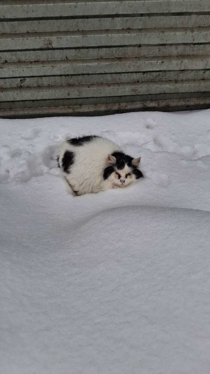 В конце декабря муж гулял с собакой и нашли кошку,которая сидела вот так в снегу на обочине .Нашел ее пес,но она вообще никак не реагировала на его присутствие и попытки добраться до нее и откусить жопу .Муж скинул эту первую фотку и стало понятно,что надо спасать -думали что глазки сильно закисли и она не может их открыть поэтому.