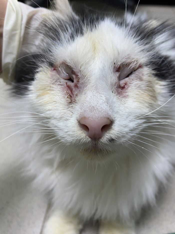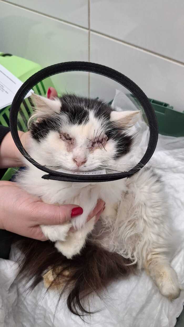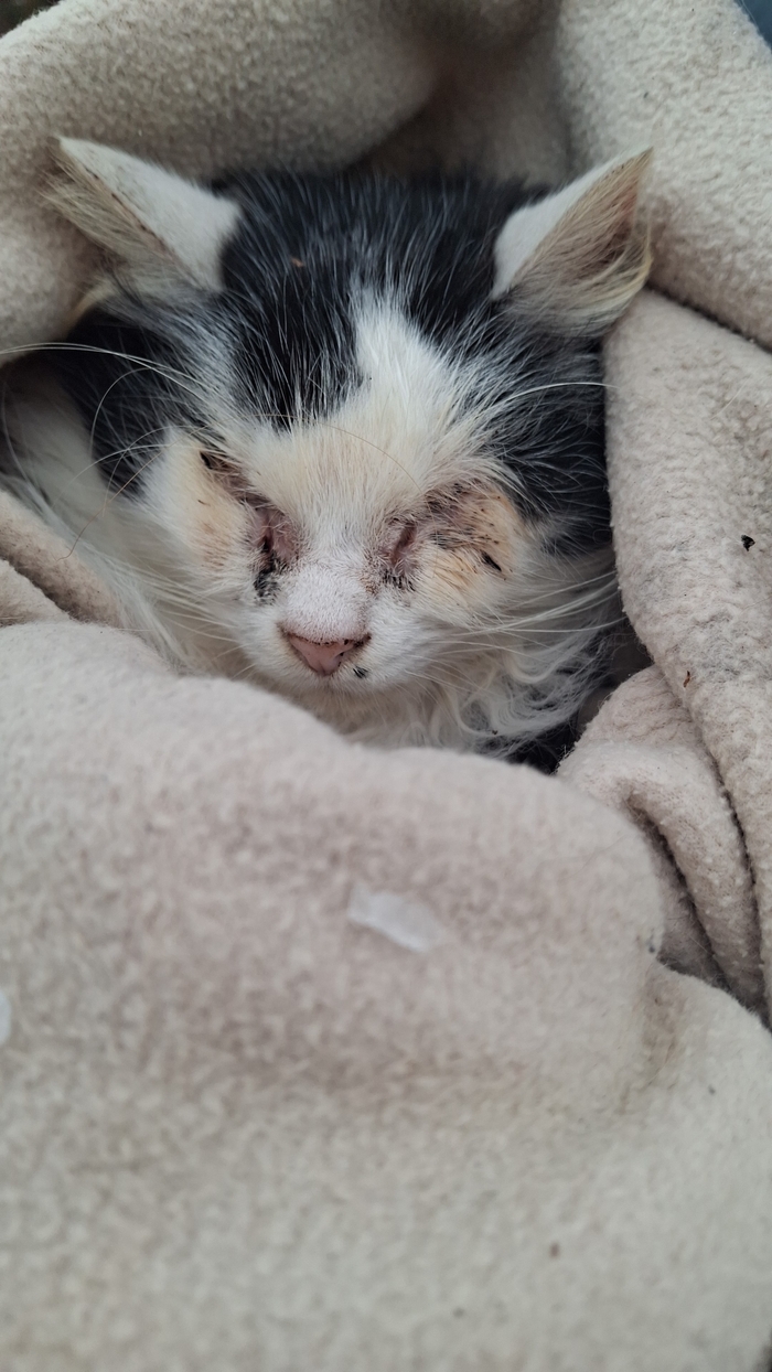 Я взяла хлоргексидин,ватные диски и поехала к ним. Взяли в плед -она не сопротивлялась и сразу попыталась зарыться в плед поглубже.Немного протерли глазки и обнаружили что у нее глазок нет вообще . Первые мысли -хоть бы их никто не выковырял из нелюдей.Оставить умирать не могли,нашли ближайший стационар ,отвезли туда,сдали аналтзы и оставили ее там пока буду результаты.