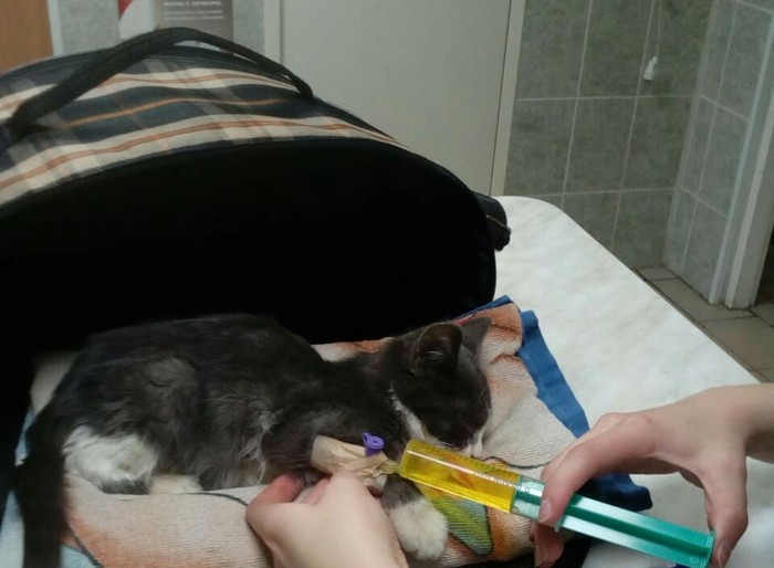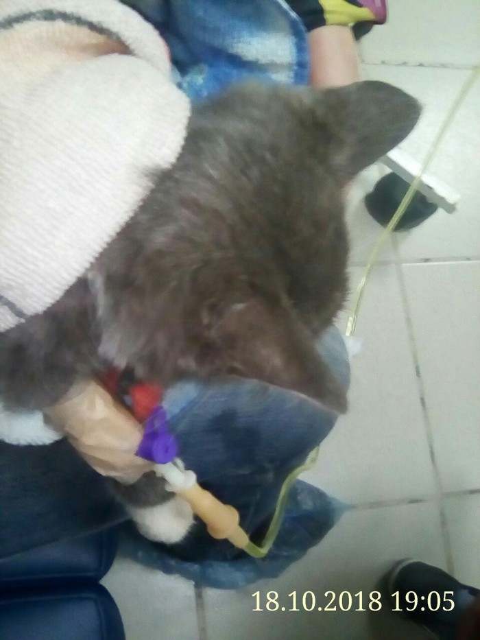 Мы нашли его случайно (вообще помогали соседям искать совершенно другого кота), но пройти мимо Огуречика не смогли. Он не мог разлепить глаза от гноя и был холодным (в прямом смысле этого слова – у него была сильно понижена температура). Изначально надеялись, что он просто замерз и все, что ему потребуется – лечение глаз и избавления от всяких глистов и блох… аннет. Дома выяснилось, что он не хочет жрать, не гадит, но писает кровью, бонусом отказывается от жрачки, еще шатается при хотьбе. В вет.клинике бывалая тетя-врач (я ее знаю, обычно она непроницаема, как сталь) аж ахнула от его огуречного состояния, сказав, что без помощи он через пару дней он отправится к праотцам. Ну, как мы могли это допустить?
