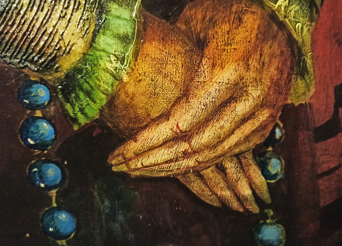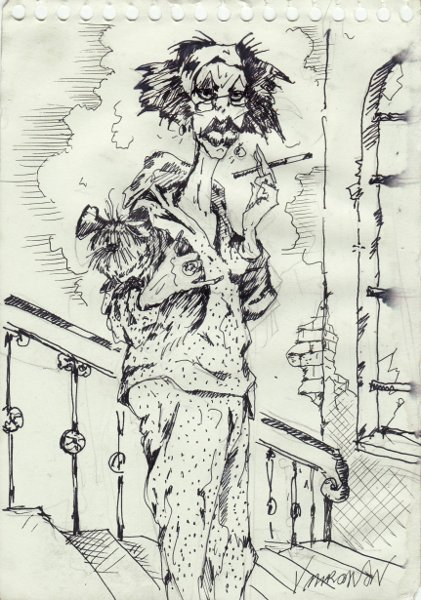 Стою как-то у мольберта, захвачен творческим процессом, пишу. Под ногами ковер, я босиком. Звуков издаю не больше, чем та парализованная старушка. Вдруг слышу, в дверь стучат, да так настойчиво, чуть ли не ногами. Открываю, стоит наша красотуля. Модный плюшевый спортивный костюм с капюшоном канареечного цвета с кое-где застиранными пятнами от вина. Маленькая собачка в руках, для успокоения нервов ,хотя видно что это помогает слабо. Нервы у нее на пределе, она просто на грани нервного срыва.
