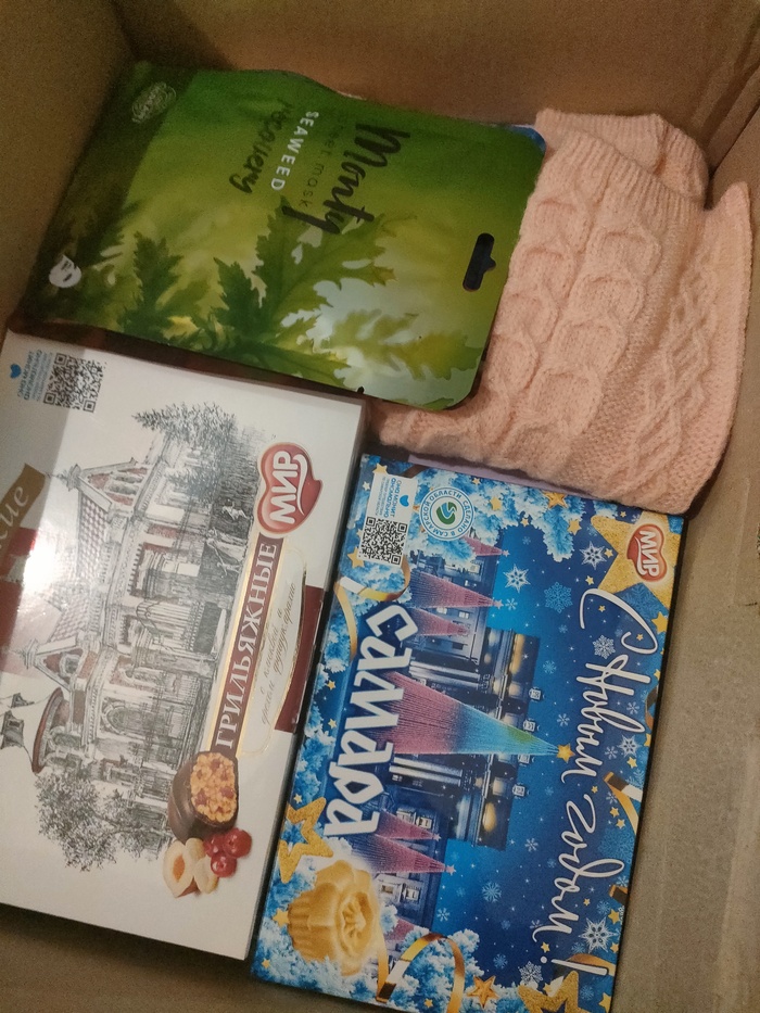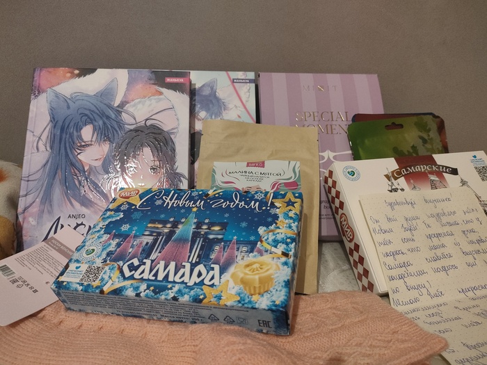 Огромнейший теплый мяяяяягкий плед с медведями, умопомрачительный календарь с котейками, вкуснющие конфеты, раскраска, поделка и карандаши для дочери, прикольные обложки и замечательная открытка! СПАСИБО!!!!!