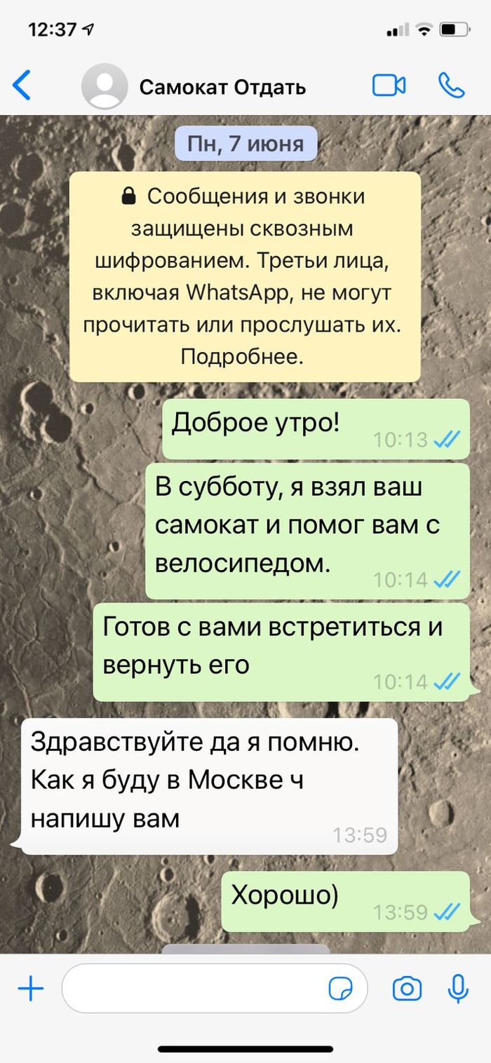 Приехал как то поздно ночью домой, в начале лета. По дороге шла мама, с кучей сумок, самокатом и ребенком на шее. Ей было очень тяжело и неудобно. В итоге она психанула и решила выбросить самокат, а я, как раз, поравнялся с ней и предложил его забрать домой на хранение и отдать когда ей будет удобно. В итоге прошло лето, она не отвечает на ватсап, самокат стоит на балконе.