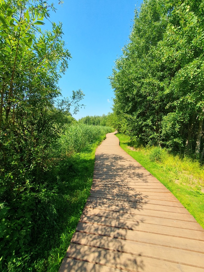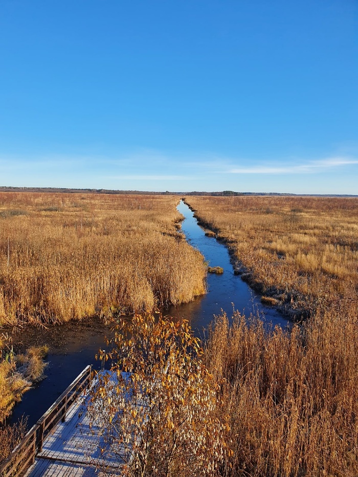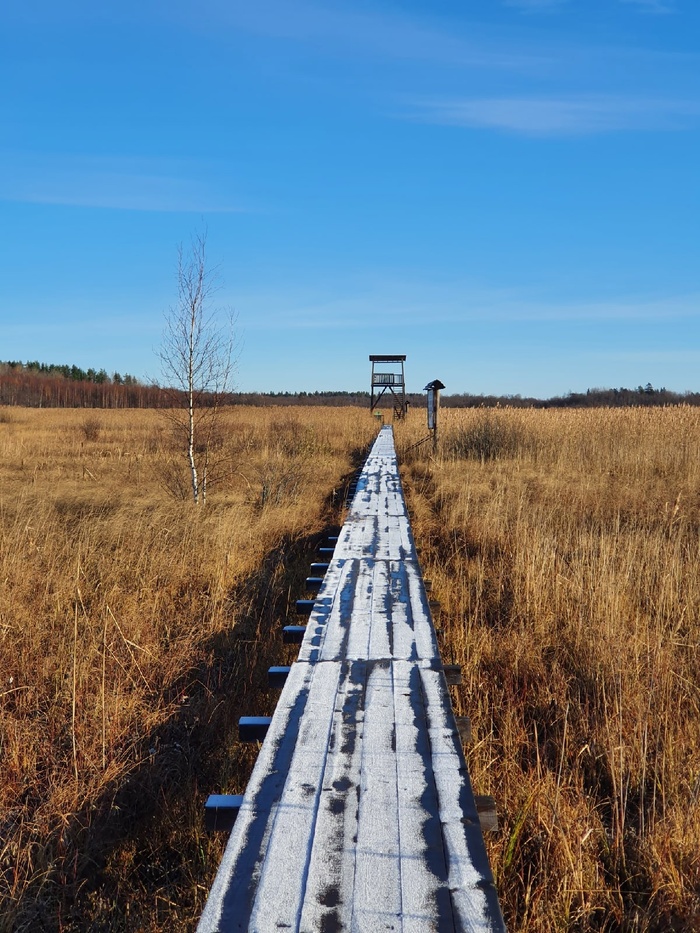 До последней вышки ведет очень длинная деревянная дорожка на сваях вдоль болотистой местности, открываются очень атмосферные виды.