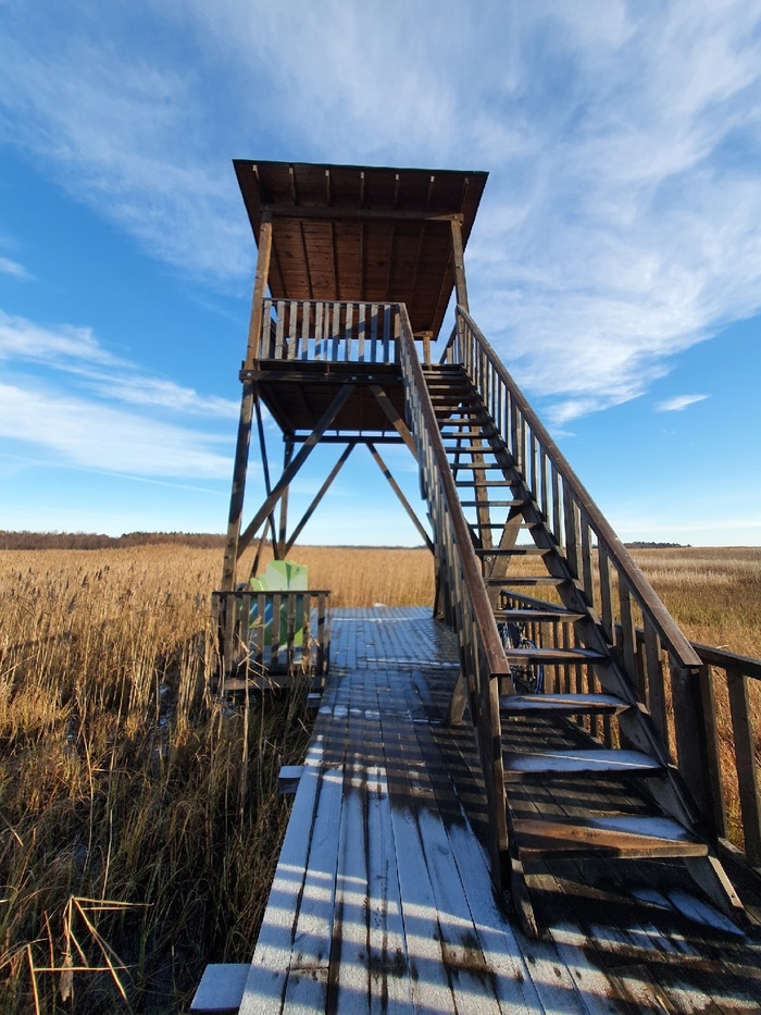 В заказнике расположены 4 орнитологические вышки для наблюдений, они довольно высокие и в хорошем состоянии. Говорят, с них иногда можно увидеть не только взлетающих птиц, но и даже лосей и тд, живности тут хватает, судя по стендам.