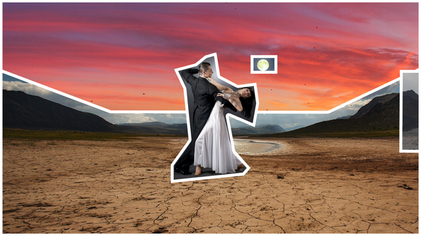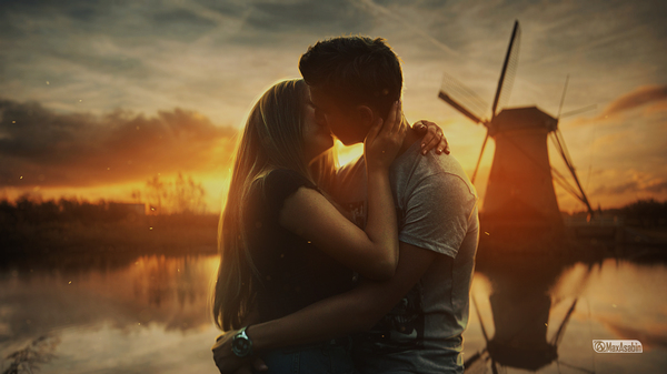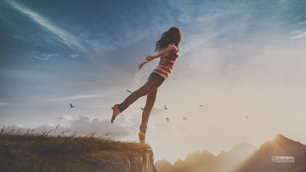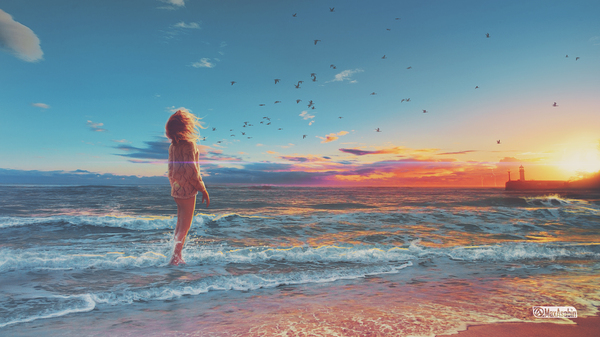Как ни странно, самый трудный этап закончился и дальше работа шла как по маслу. Я добавил ловца снов и небольших пятен акварели по краям, немного повозился с грамотным расположением и цветокоррекцией лиц и поверх добавил ярких оранжевых световых эффектов.