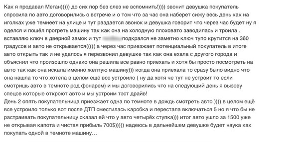 — Когда девушка покупала у меня машину, это была самая низкая цена в интернете. Да, машина была не в идеальном состоянии, но и стоимость соответствующая. С этими 700 долларами прибыли я приукрасил для читателей «Драйва». Я, если честно, не считал, но думаю, что вышел в ноль с этой машиной. Я приобретал ее через обмен, и обошлась она мне в 1100 долларов. Плюс все работы, которые были сделаны. Про лонжероны и прочие дефекты я насочинял для того, чтобы поднять интерес к своему бортжурналу. Сейчас понимаю, что сделал себе черный пиар. Но, учитывая ценник, машина была действительно в достойном состоянии! Двигатель работал идеально. Свечи, масло — все поменяно. Я не понимаю, какие могут быть вопросы по этой машине. Приезжали и другие люди смотреть. Одни даже предлагали оставить 100 долларов залога перед вторым приездом девушки. Я позвонил ей и сказал, что автомобиль готовы забрать. Она ответила, что будет покупать, и я отказал тем людям, которые предлагали оставить задаток. По словам самой девушки, для нее было главное, чтобы машина была желтой, с рабочими фарами и пройденным техосмотром. Другое ее особо не волновало. И если эта девушка такая порядочная, то почему она уже выставила на продажу Megane по завышенной цене ($1590) и не указала дефекты, которые есть в машине? — рассказал парень.