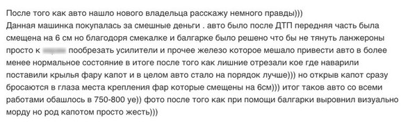 Две недели назад бортжурнал продавца пополнился еще одной заметкой, которая называлась «Ремонт морды эконом вариант!)» (орфография и стилистика автора сохранены). Вот скриншот с «Драйва»: