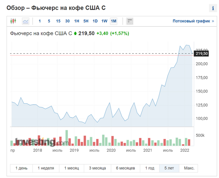 Просто посмотрите на стоимость кофе на бирже за последние 5 лет: