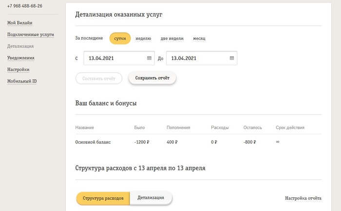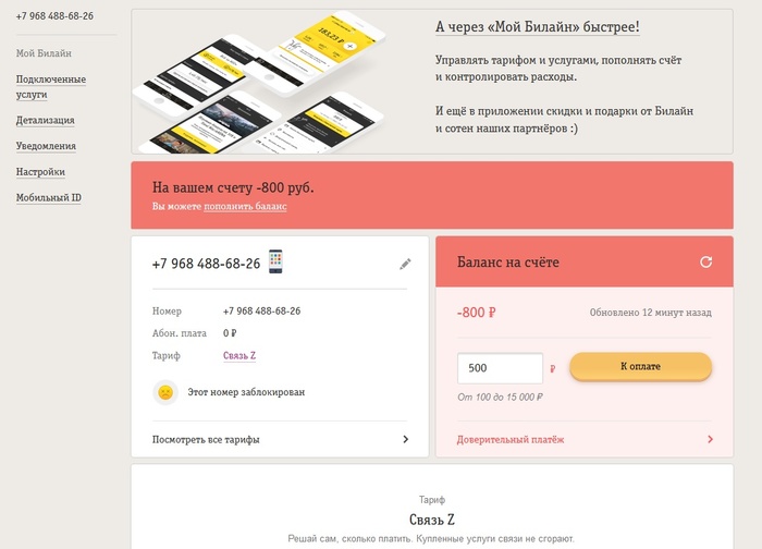 Поняв что сим-карта не активирована, я безуспешно пытался ее активировать, в итоге пришлось звонить в поддержку, где меня обрадовали что я им еще должен заплатить денег потому что у меня подключено 3 пакета по 30гиг. Это новая СИМ, в первый раз вообще пользуюсь связью Билайн и карта в статусе Блокировки и кто подключил 3 пакета вместо одного, но оператор не знает как такое могло произойти, предложил оставить заявку в течении 3х рабочих дней... Зарегался в ЛК билайна от туда скрин со своим номером где почему-то зачисление +400, а не 450 и минус -800.