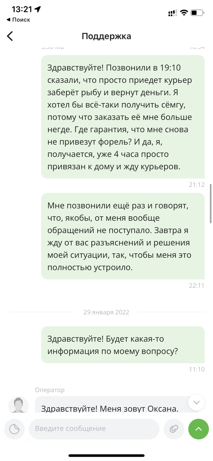 Окей, пишу отзыв о заказе, следом пишу в поддержку. Хочу либо замены на нормальную сёмгу, либо возврат денег. Никакой реакции в течение часа, потом звоню им, они оправдываются тем, что перегружены. Спустя ещё два часа мне звонят и говорят что пришлют курьера. Проходит ещё три часа, никто не приезжает. Звоню, говорю где курьер? Ответ убил - вашего обращения нет в системе, поможем вам уже завтра. Завтра наступило, сам им написал. Осветили, прислали курьера, но почему-то считают, что возврата денег с меня достаточно, за то что они обосрались до ушей. Почему селёдку не положить? Или в следующий раз свинину вместо говядины? Кто-то знает, такой подлог — достаточное основание для жалобы в Роспотребнадзор?