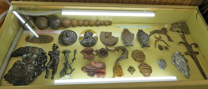 Внизу справа на кадре выше выглядывает надгробная плита Василия Воеводина, того самого крепостного-Главнокомандующего из дома с деревянной башенкой. Где сама могила - уже никто не помнит, а плиту Панфилов собрал из двух обломков, использовавшихся в Княжьем доме - один был шестком печи, о буквы другого вытирали ноги при входе. На витрине - изделия завода разных лет, в том числе ядра Наполеоновской войны: