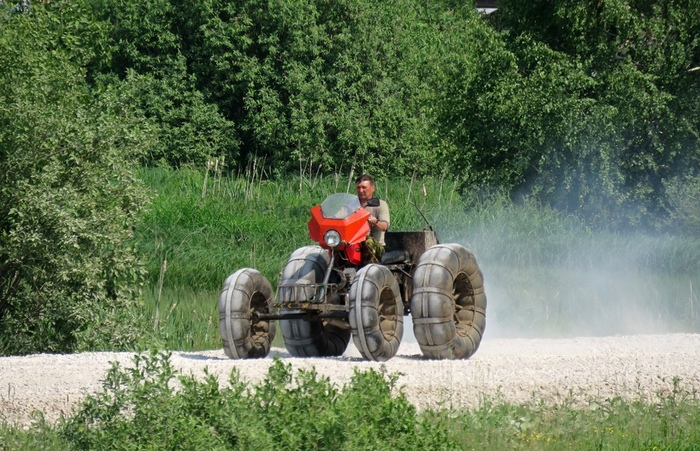 На прощание музейщики подарили мне ручку с надписью "Пожва". Подаренная чуть раньше на Байконуре ручка "Роскосмоса" к тому времени уже развалилась, а вот пожвинская - пишет до сих пор. Выйдя из музея и пообедав в столовой, я увидел, что на площади, неуклюже поднимая пыль, разворачивается огромный кудымкарский автобус - он только прибыл, а назад в краевой центр пойдёт лишь через три часа. Отстаиваться он поехал в Лемпиху, а меня довёз до остановки у выезда. Последним впечатлением Пожвы стал мчавший по Широкой улице пневмоход: мотоцикл с мягкими приспущенными камерами от тракторных колёс. Он отлично ходит по рыхлому снегу или болотам, при этом не повреждая почву, а потому без пневмоходов уже несколько десятилетий невозможно представить себе Крайний Север. Такие маленькие смоделки на северах называют "каракаты", а "пневмоход" там - это тяжёлая заводская машина. Пневмоходы, во главе с крупносерийным "Трэколом" и инновационным "Шерпом" - веяние новое и перспективное: хотя по грузоподъёмности они пока существенно уступают гусеничным вездеходом, проходимость у них как бы не выше, а главное - колёса не портят тундру. Теперь, кажется, каждом крупном северном городе есть мастерская, где колесные вездеходы разарабатывают местные умельцы и делают мелкосерийно. На двух таких машинах - "Xpen" из Усинка и "Тром" из Сургута, - мне довелось поездить в 2016-м году. Но изобретателем пневмохода по крайней мере сами пожевляне считают своего "дядю Пашу Суханова", который сконструировал такую машину у себя в гараже в 1970-е годы, разочаровавшись в бесполезных летом аэросанях. Теперь тут периодически проводятся гонки на пневмоходах, а отдельные машины делаются и на заказ для других городов и весей. Пожвинский завод умер, а вот ведь дело-то его - живёт…