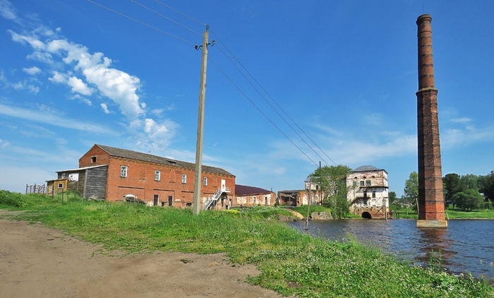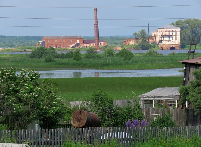 Если Дедюхин близ Березников - уральский родич Мологи, то в Пожве можно вспомнить скорее Калязин. Только в горнозаводском краю не колокольня торчит из волн водохранилища, а труба, когда-то стоявшая посреди каре заводских корпусов. Не знаю точно, когда была построена её нижняя гранёная часть, но если вместе с цехами в 1810-х годах - то кажется, я нашёл старейшую промышленную трубу в России. Она порядком накренилась и думаю, в обозримом будущем рухнет: