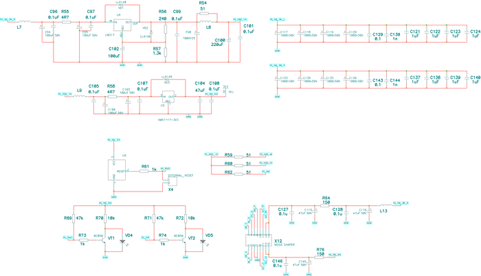 Питание вспомогательных цепей и внутренних цепей усилителя организовано на LM317 и AMS1117-3.3. Все цепи питания имеют RC фильтры, существенно снижающие пульсации на соответствующих линиях.