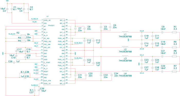 Тип и номиналы в выходном фильтре решено было брать самого лучшего качества, несмотря на занимаемую площадь на плате и стоимость. В качестве катушек индуктивности в итоге прижились дорогущие Wurth 7443631000, а конденсаторы плёнка Epcos серии B32521. Тип и номиналы выбирались по аппноуту TI для расчета номиналов выходных фильтров. Частота среза на вскидку в районе 45-50 кГц.