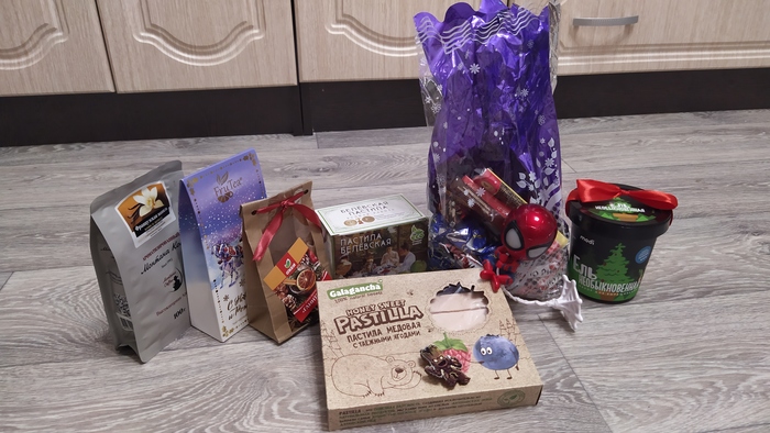Подарок шикарен! Пастила, набор для приготовления глинтвейна, ароматный кофе, баночка с землицей для выращивания ели необыкновенной и много-много вкусных конфет!