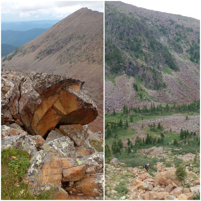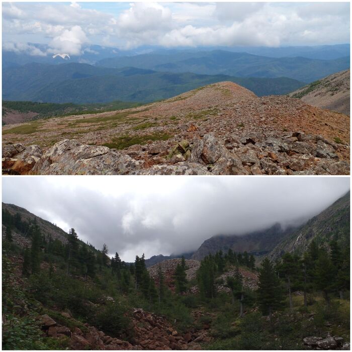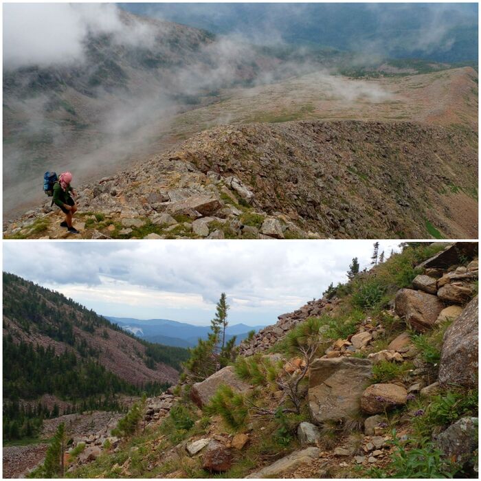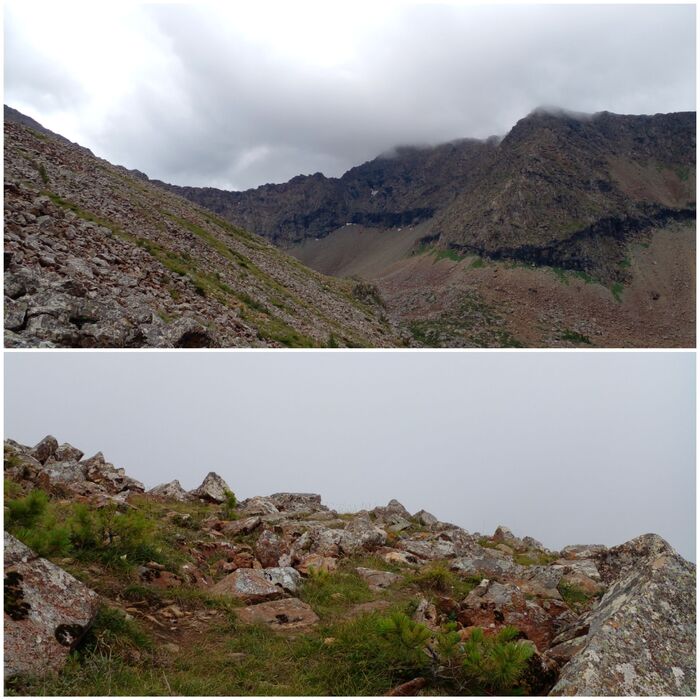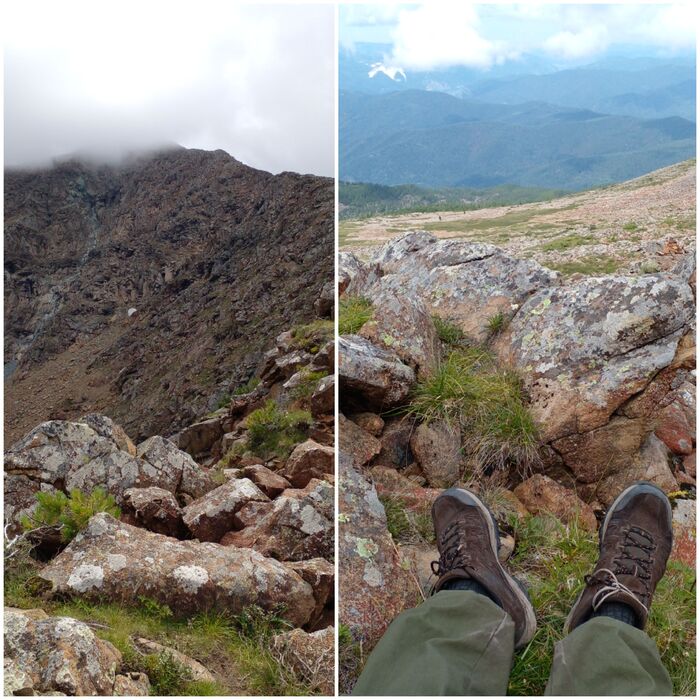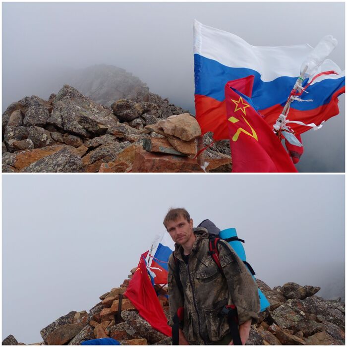 А это, собственно, я. Меня Константином звать. В 14:22 сделаны эти кадры, семь часов пути наверх. Дошел, было нелегко, посещали мысли остановиться. Трое наших ребят вот остались, ждут ниже. Но продолжил подниматься по камням, будто по огромным неравномерным ступеням. Холодный ветер, едва дышится от усталости, и что-то двигает дальше - нельзя не дойти. Каждый шаг был все мучительнее, но вел к вершине, одному из четырех пиков хребта, пусть и не главному.