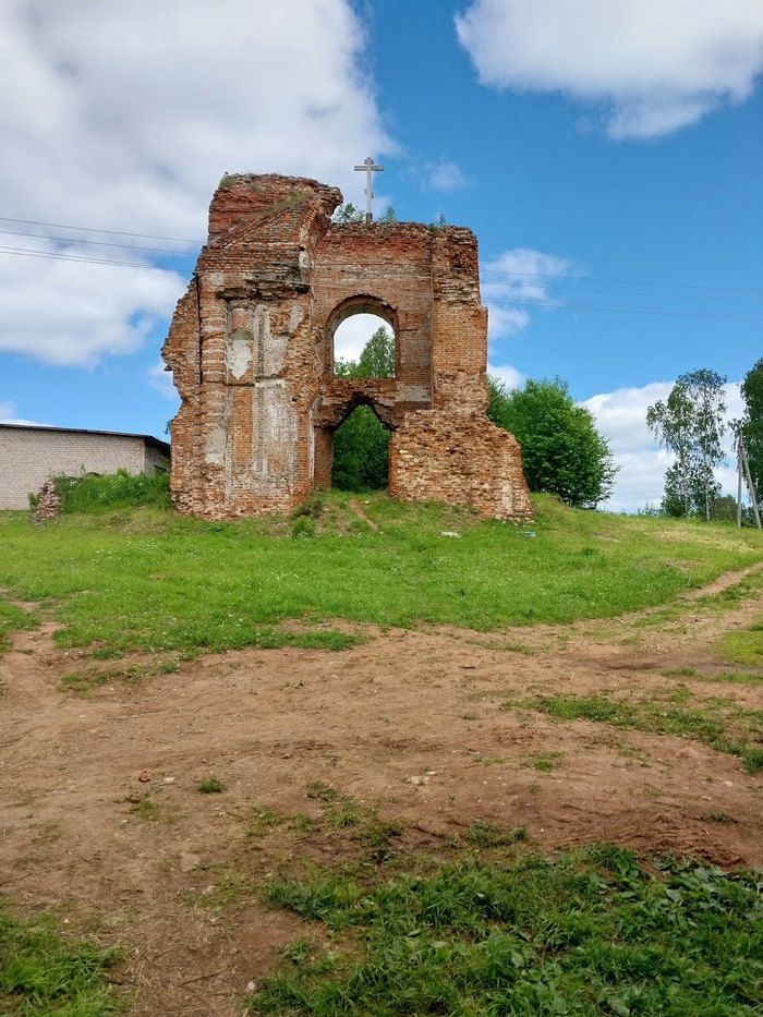 Аллея в самом центре поселка ведёт к руинам колокольни Вознесенской церкви.