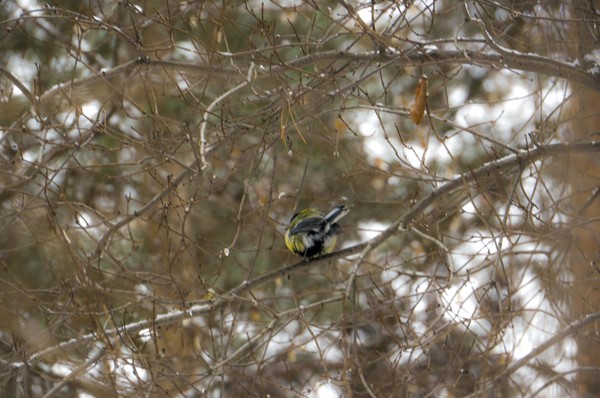 После сорока минут блужданий я наконец обнаружил вертлявых проказниц. Я пытаюсь сфотографировать синицу, но я видимо чем то ее обидел и она от меня отвернулась. Ииии тут моя камера возвещает, что она разряжена - акум ожидаемо замерз. Не беда, думаю я. Лезу во внутренний карман и мгновенно понимаю что я немного несобранный - я забыл запасной аккумулятор.