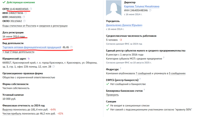 это еще что за прикол? Адрес совпадает, огрн совпадает, компания старая, но вид деятельности "Торговля оптовая фармацевтической продукцией 46.46.1", это как?