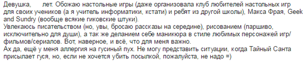 Кстати, про "О себе". О приёме заявок на участие я узнала через пару дней после официального прекращения, поэтому описание своих вкусов/интересов было поспешным и непродуманным. Я честно пыталась сообщить о себе максимально кратко всё то, что считала важным. Это было вот так: