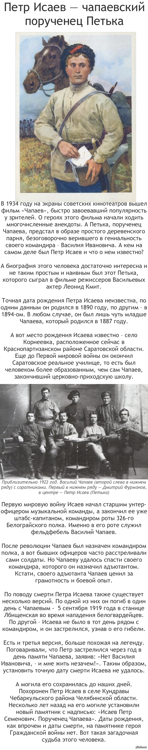 143 mentjens Петр Исаев — чапаевский порученец Петька 10 лет назад Показать полностью 1 Чапаев Порученец Биография Длиннопост Петька и Василий Иванович