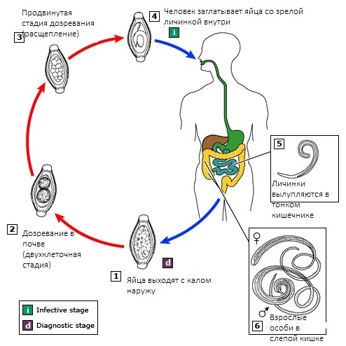 Так же возможный общеинтоксикационные симптомы, типа тошноты, снижения аппетита, раздражительности, сонливости, слабости.Диагностика: анализ кала на яйца гельминтов по Като или методом обогащения, трёкратно.