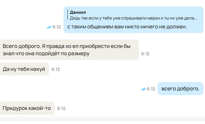 Якобы клиент на 100 тысяч. Хочет через меня закупить жилеты юникло. Мамой клянется что всё в ажуре и просит пойти в тц посмотреть наличие жилетов и что даже мне заплатит за информацию 1000р(его слова не мои). Ну я пошел в тц(не ради него а просто в магаз надо было). ну заодно посмотрел потратил 5 минут - продавец получил информацию что жилеты в наличии и кинул в игнор. Я не обижен. Я и в след раз зайду если попросят и мне будет по пути(работа посредником предполагает что такое случается и бывает по 30 раз в день я выставляю расчет на свои услуги а меня кидают в игнор). У человека 864 5+ рейта 0 негативов. Как вы думаете он работает с отзывами? Если он по жизни разводит людей. Конечно да.