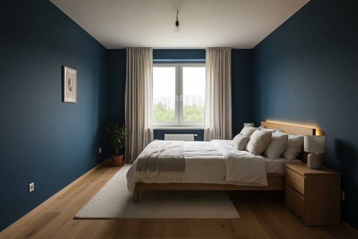 Дальше я взялась за спальню. Описала задачу так: «Сделай ремонт в этой комнате. Это спальня площадью 16 кв. м. Хочу спокойный и уютный интерьер. Стены — в темно-синих оттенках, текстиль — натуральный лен в молочных тонах. Мебель — из светлого дуба, у изголовья кровати — теплая подсветка. Освещение мягкое, атмосфера расслабленная, без лишнего декора».