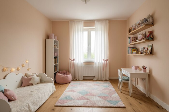 Последней на очереди была детская комната. Промт я сформулировала так: «Сделай ремонт в этой комнате. Это детская площадью 12 кв. м для девочки 6 лет. Хочу светлое и теплое пространство. Стены — светлые, с персиковым подтоном. На полу — ламинат под дуб. Добавь уютный ковер, небольшой письменный стол у окна и открытые полки для книг и игрушек. Цвета в текстиле — пудровый, бледно-голубой и белый».