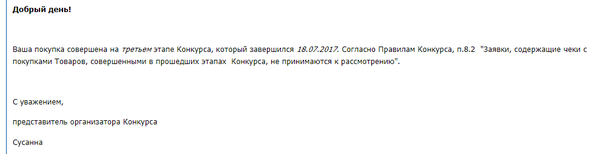 Значит купили порошок 16.07, отправили фото чека 19.07, вроде и немного времени прошло.Ну значит присылают мне ответ.