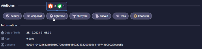 Есть обычные атрибуты, как lightrose цвет глаз они дают +1/-1 стихиям, а в геноме обозначаются одной цифрой. Но есть и редкие атрибуты, которые отмечены бриллиантом (как chipocat), они дают больше плюсов, но не всегда видны визуально и формируются только если совпадут несколько цифр генома.