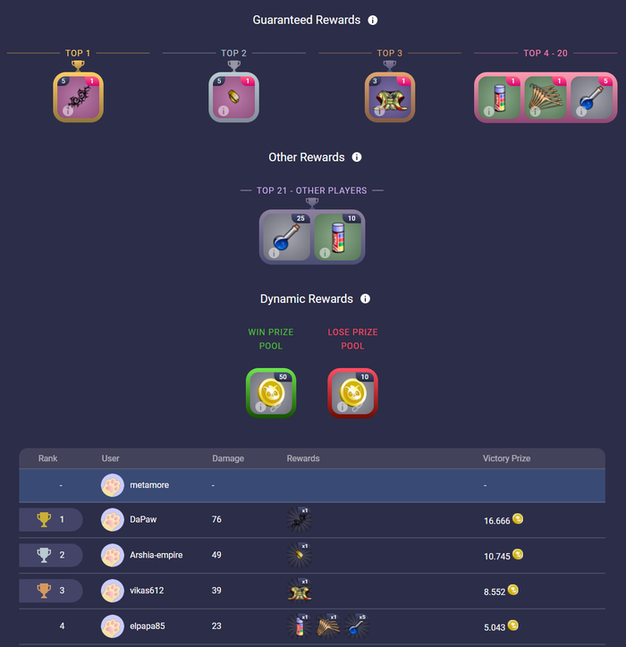 У каждого босса свой принцип боя. The Red Devil например после убийства появляется с более высоким уровнем, и пул призов распределяется для участников снова.