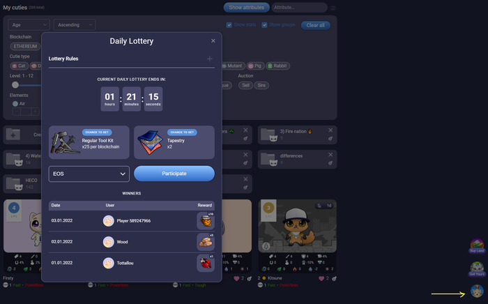 Справа внизу есть иконка розыгрыша, в котором достаточно просто подписать транзацию на своём блокчейне и получить шанс выиграть предметы либо гарант в 10 paw coins (тратятся в Paw Shop).
