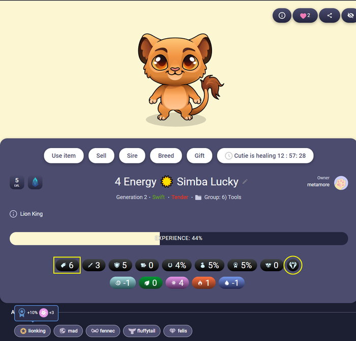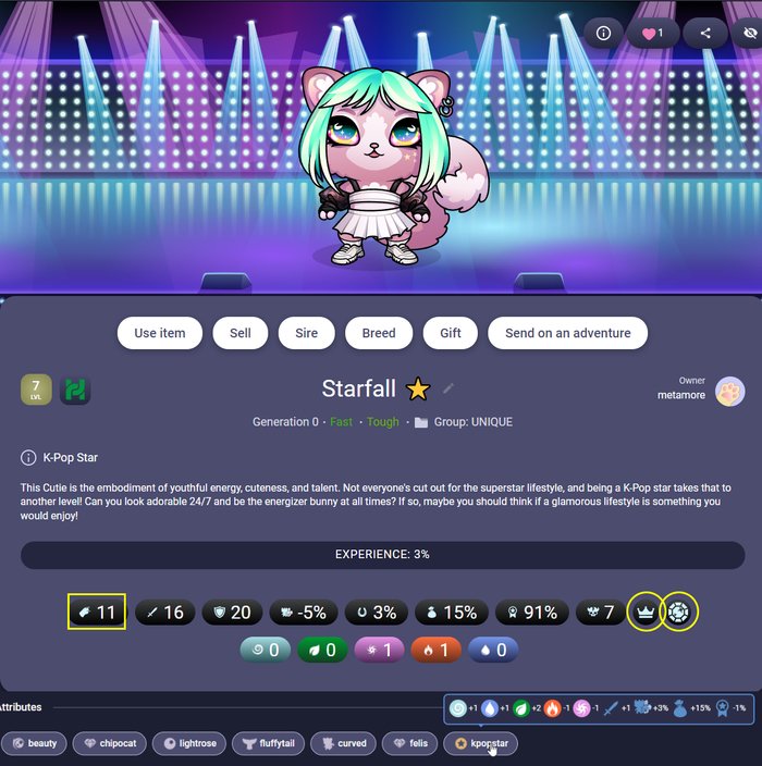Каждому новому игроку даётся 1 пробный бесплатный кутик, чтобы познакомить с интерфейсом, но его функционал ограничен (прокачивается только до 5 lvl и не может скрещиваться). У него, как и у всех других милах, есть множество характеристик, которые составляют его ценность для сражений и коллекционирования: