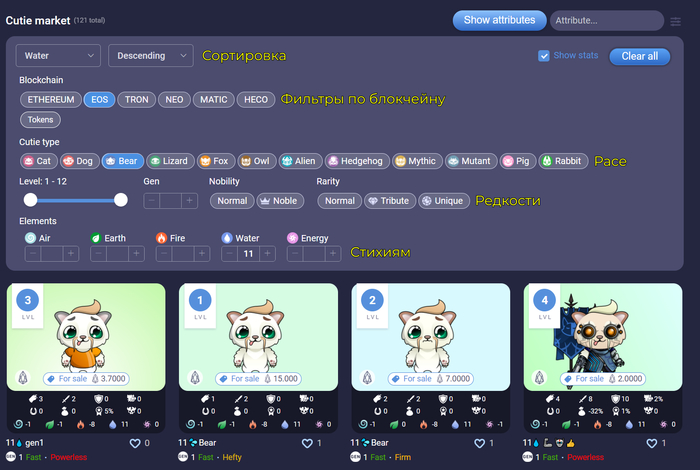 Это коллекционная игра, в которой сражаются NFT милахи (cutie или кутик как их называют). Их статы зависят от набора генов при рождении, а также баффов от предметов. На выбор есть как стандартные котики и собачки, так и эпические инопланетные расы, подробнее расскажу ниже, но сначала...