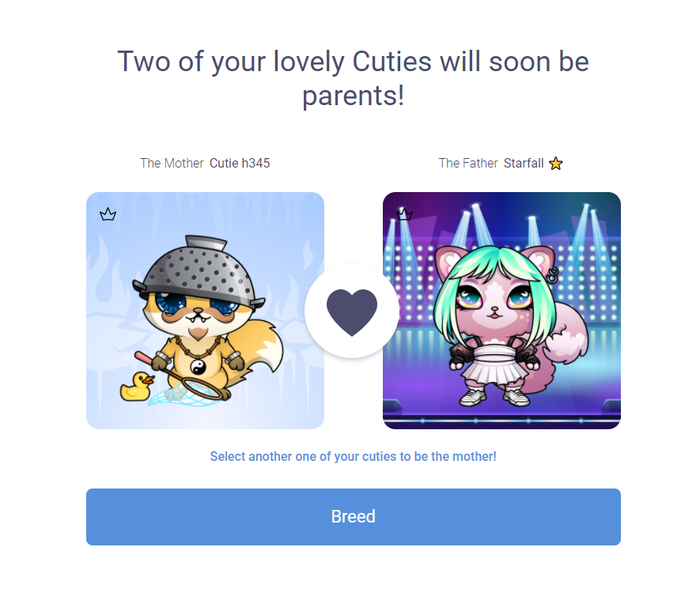 Можно скрещивать не только двух своих кутиков, но и искать им пару в For Siring, но тогда к комиссии бридинга и блокчейна плюсуйте ещё цену услуг выставленного кутика :)