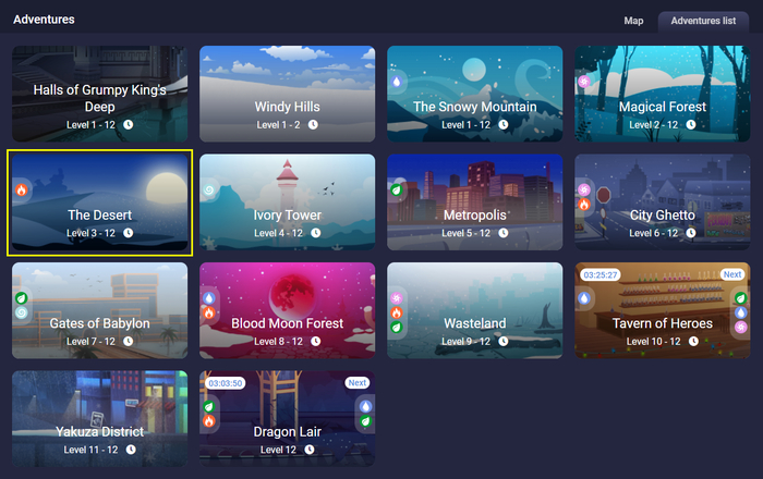 Стихии учитываются в разных сражениях, прибавляясь к атаке и защите кутика. Первые сражения, в которых вы сможете участвовать будут походы в приключение, их иконки стихий подскажут, каких кутиков посылать (огненных в Desert).