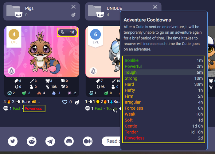 - Уникальный / Unique - самый редкий тип кутиков, обычно выпускается ограниченным тиражом. Они имеют бонус к силе +2 или больше, и тоже не меняют свой облик при применении предметов. Максимально прокачиваются до 12 lvl, то есть могут ходить в высоколевельные приключения. Их можно отличить по золотому атрибуту и значку круглого драгоценного камня.