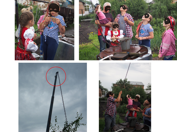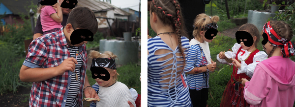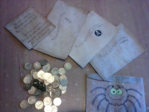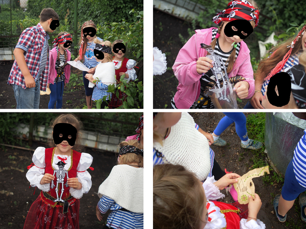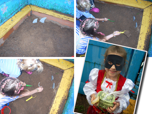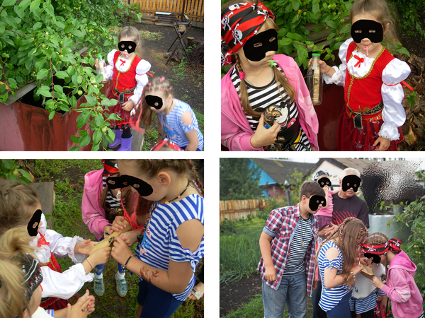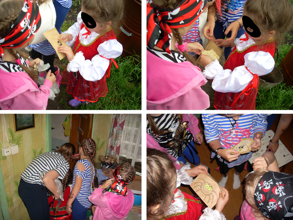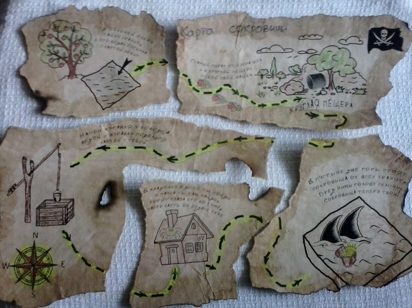 Первая часть карты была вручена виновнице торжества в качестве подарка. Перед вручением закинул в бак-озеро бутылку со второй частью карты, еле добрался до пещеры на другой конец огорода (тапки от налипшей грязи еле поднимались). Бетонное кольцо (круглая пещера) так удачно закатили под яблоню, что его можно было увидеть только дойдя до деревьев вплотную, там и положил "останки" старого пирата и третий кусок карты. Ну 4й примотал скотчем к верхушке колодезного журавля, а заключительный запрятал на полке в кладовке так, что торчали только глаза. Клад закопал позже по ходу дела, опасаясь, что сразу решат покопаться в песке.