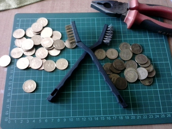 Разменял в банке деньги по 10 рублей и принялся их чистить. Лучшим вариантом оказалась щётка-крацовка с не очень жёсткой "щетиной"