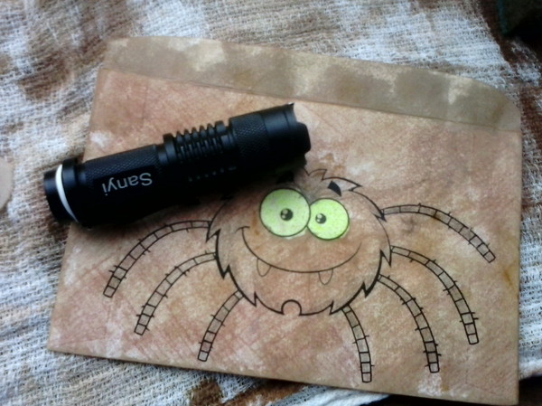 В качестве паука в кладовке решил использовать конверт с изображением паука. Ну и не забыл про "горят глаза его во тьме", и раскрасил глаза люминесцентным аквагримом (фломастеры тоже сгодятся, но их я не обнаружил).