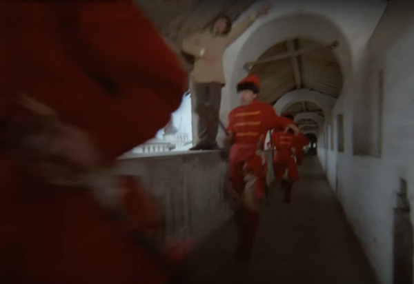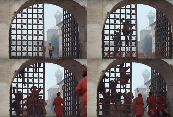 Жорж Милославский, проявляя сообразительность, прячется в своде колонны от пробегающих мимо стрельцов.