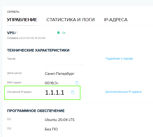 Первое это IP адрес VPS, мой реальный IP скрыт и на скриншоте для наглядности указан 1.1.1.1