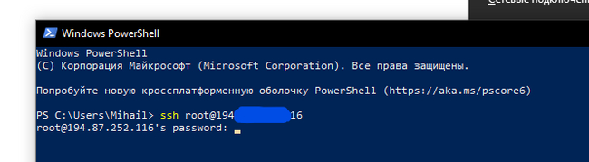 2. Скопировать пароль из консоли управления VPS или письма, перейти в консоль PowerShell и ЩЕЛКНУТЬ ПРАВОЙ КНОПКИ МЫШИ В СТРОКЕ ВВОДА ПАРОЛЯ, ГДЕ МИГАЕТ КУРСОР, нажать Enter на клавиатуре. Команда ctrl+v (или аналогичные) в данном случае не работают