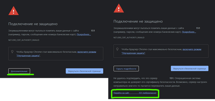 Если на странице вы увидите сообщение подобно тому, что ниже, то это нормально, дело в том что сертификат SSL, который используется для защиты страницы является самоподписным. Просто выберите «Дополнительные» и перейдите по ссылке.