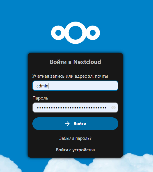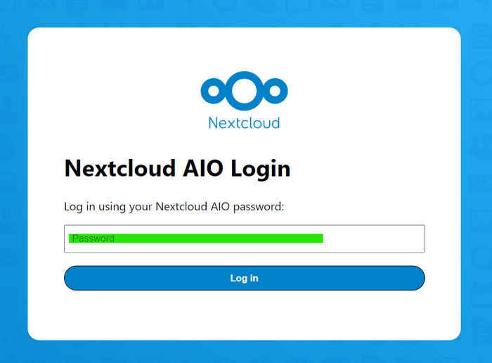 Только после того как вы скопировали и сохранили пароль можно переходить по кнопке "Open Nextcloud AIO login", на следующей странице сразу же попросят этот пароль ввести, чтобы убедиться, что у вас есть к нему доступ. Вводим пароль и логинимся.