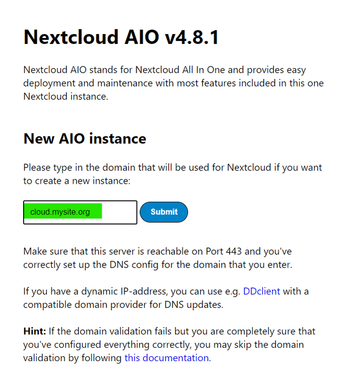По кнопке «Open your Nextcloud» можно открыть веб версию интерфейса, она уже будет на поддомене который был введен на начальном этапе. И авторизоваться там с логином «admin» и паролем с предыдущей страницы.